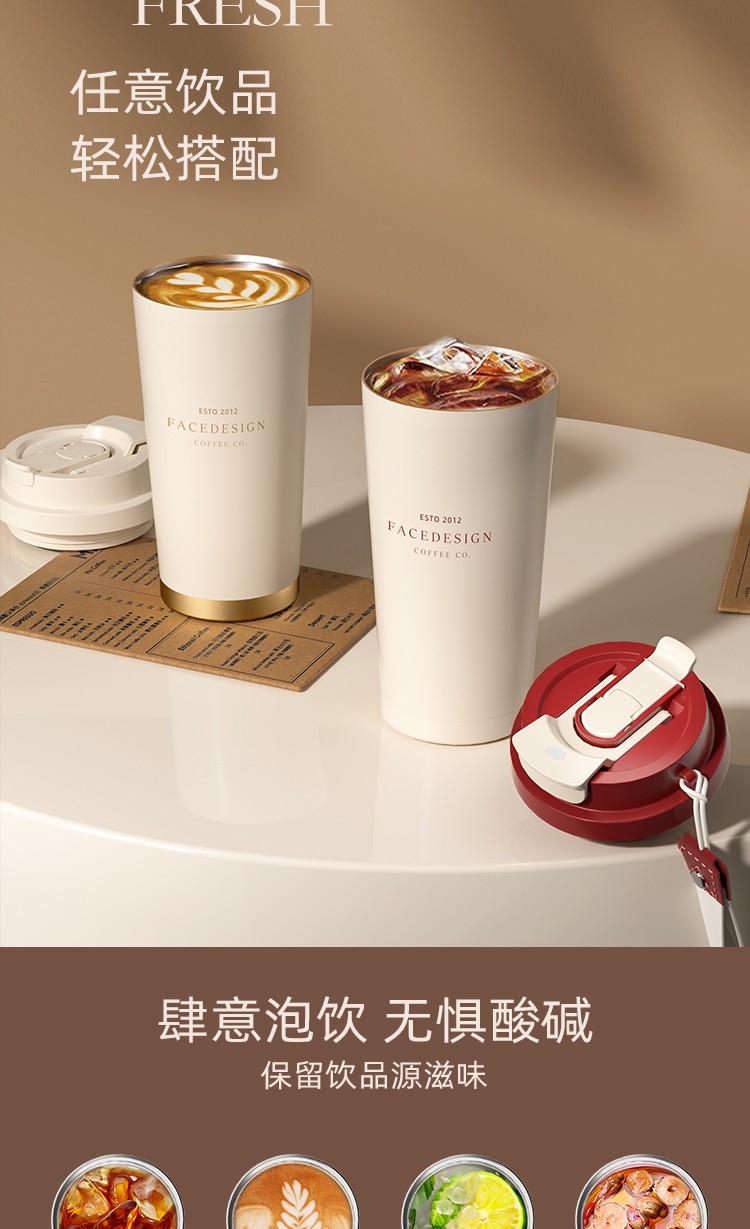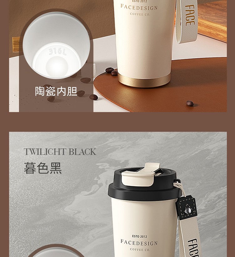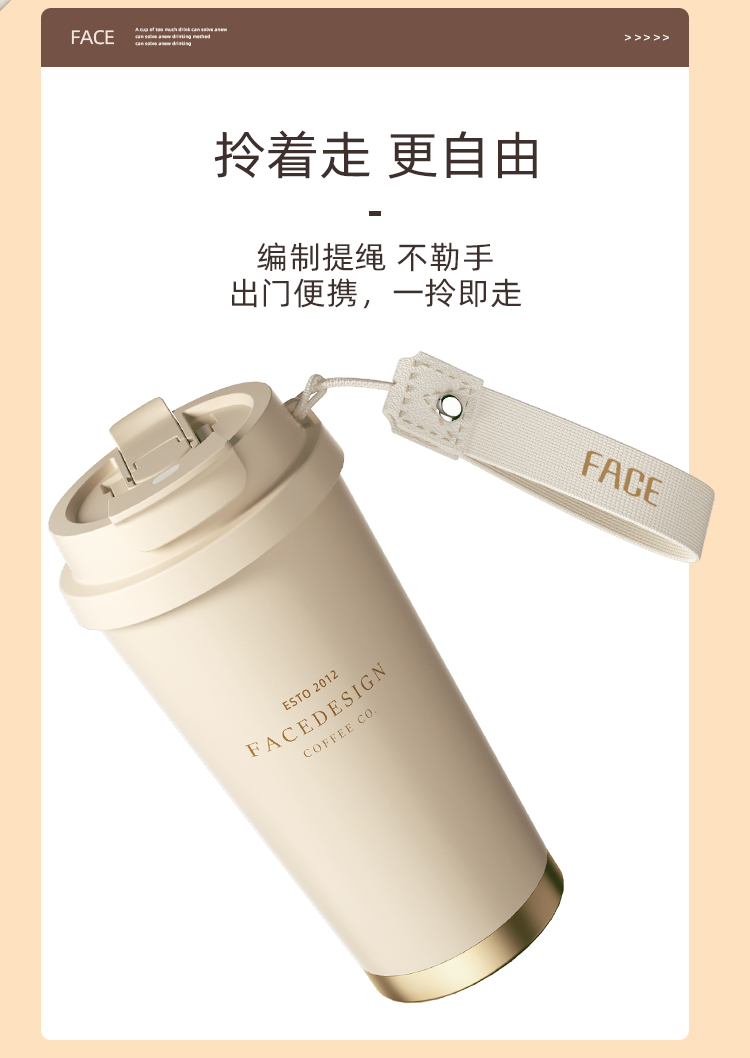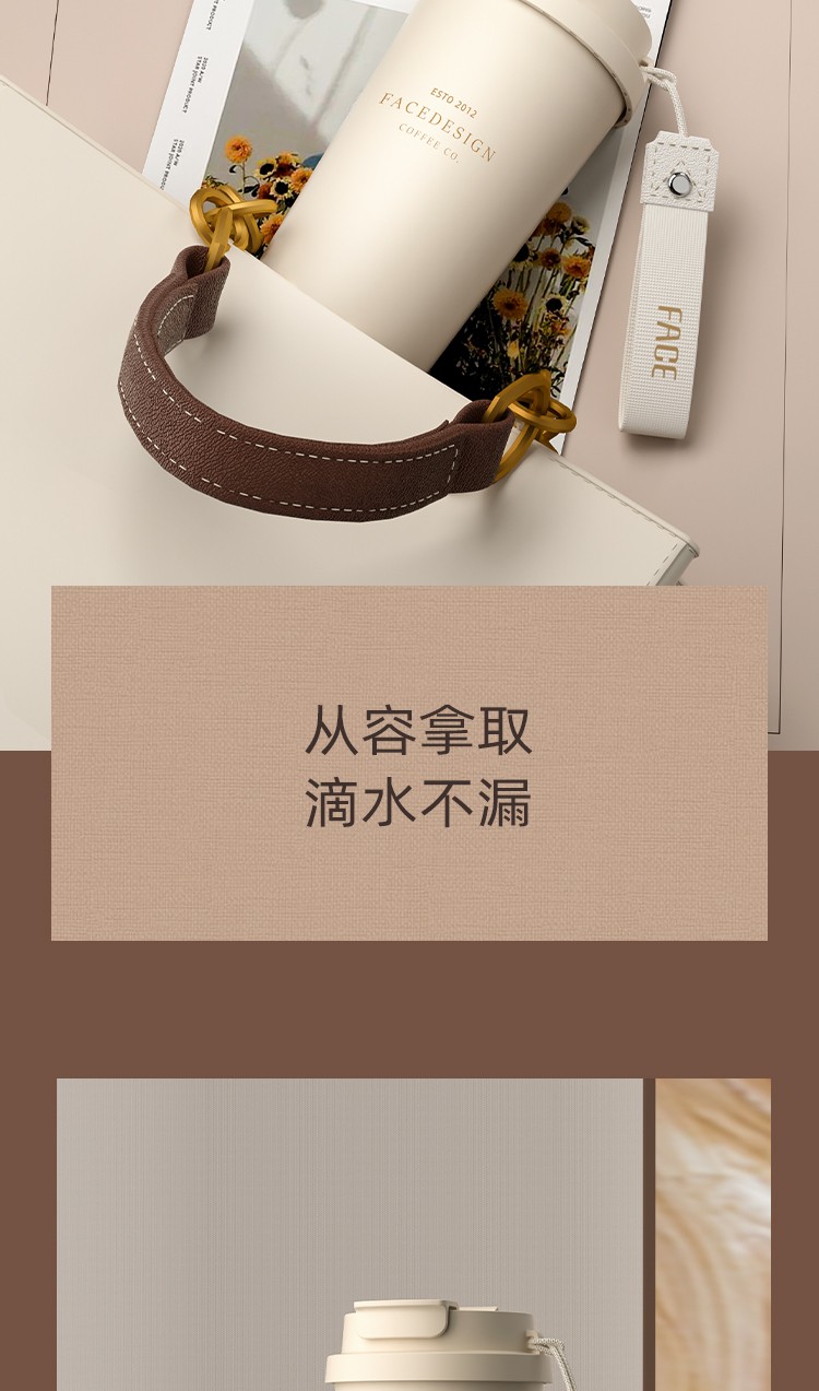 FACE 双饮手提咖啡杯(316不锈钢陶瓷涂层)无图案【金色】(530ml)