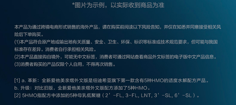 2. 您购买的所有跨境商品相关的质量、健康、安全、卫生、环保、标识等项目标准符合国外相关标准或技术规范要求,但可能与我国质量安全标准存在差异,由此可能产生的危害或相关法律责任以及其他风险,将由您个人承担,故请了解相关信息后再做下单购买。