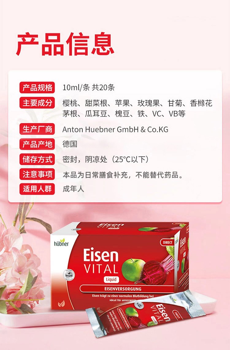 德国hübner郝柏娜 补铁补血口服液红铁元便携装 10ml*20条/盒
