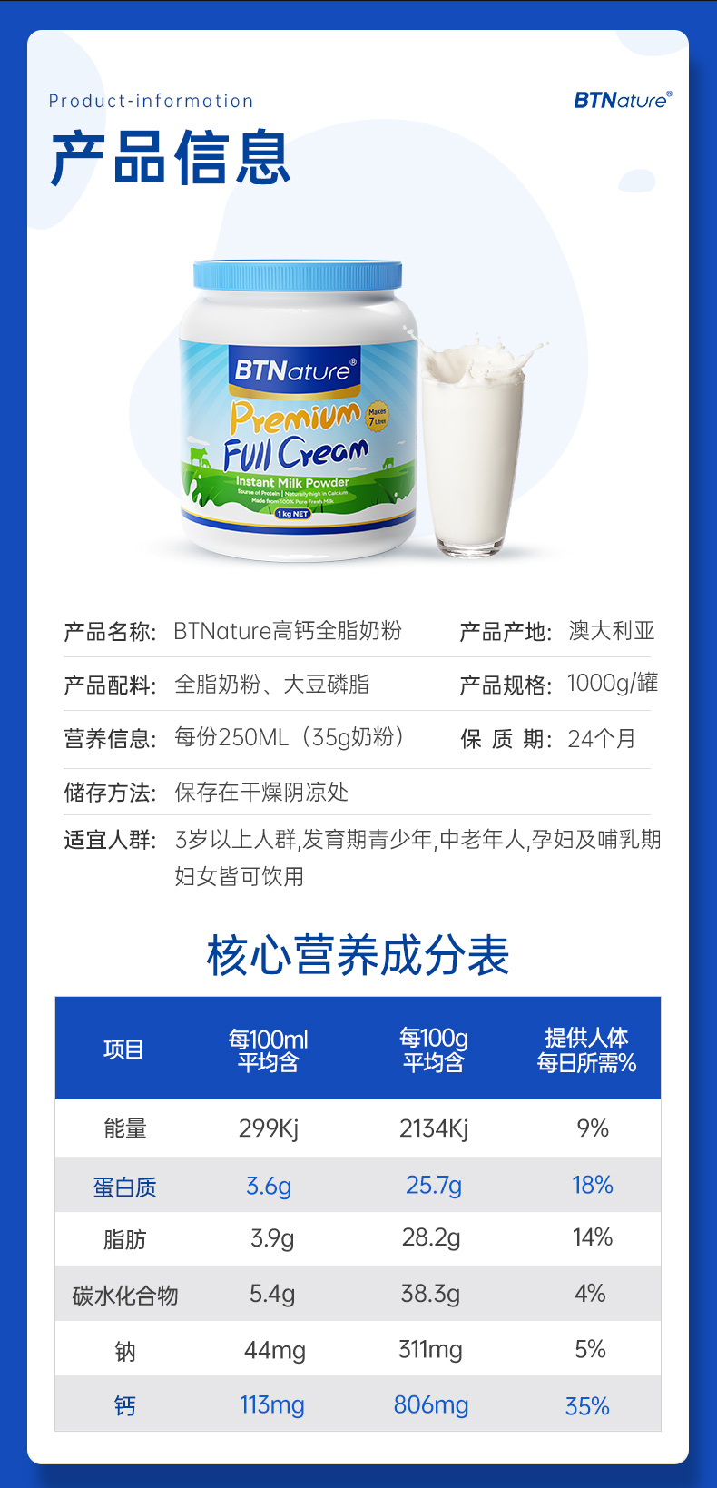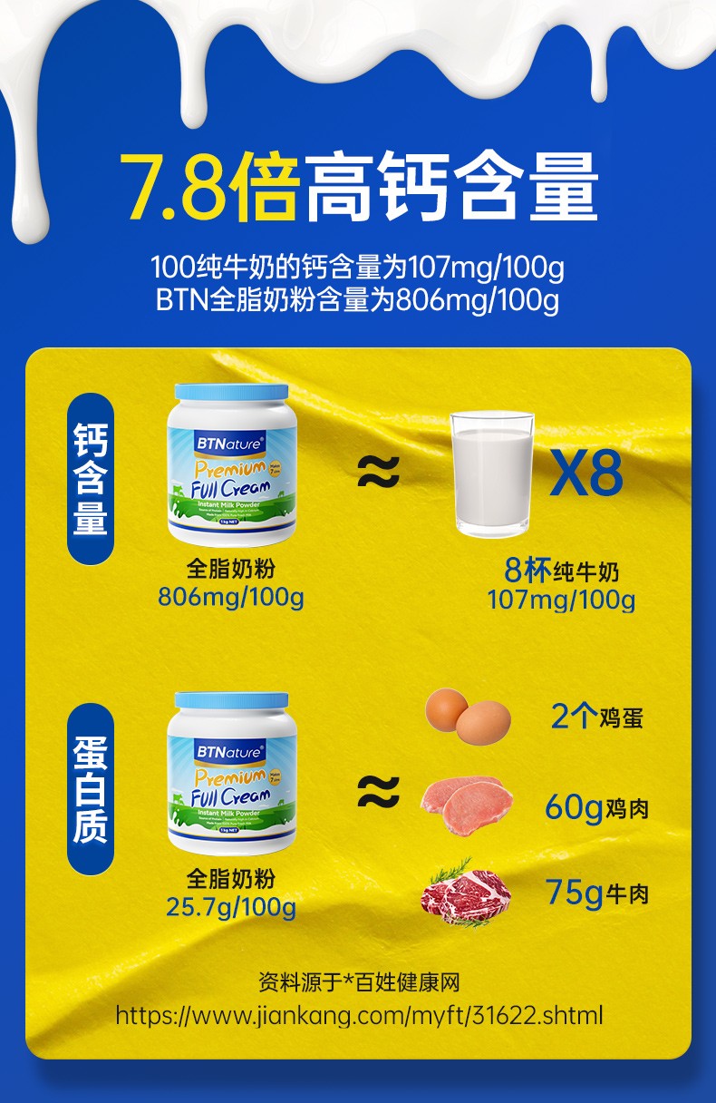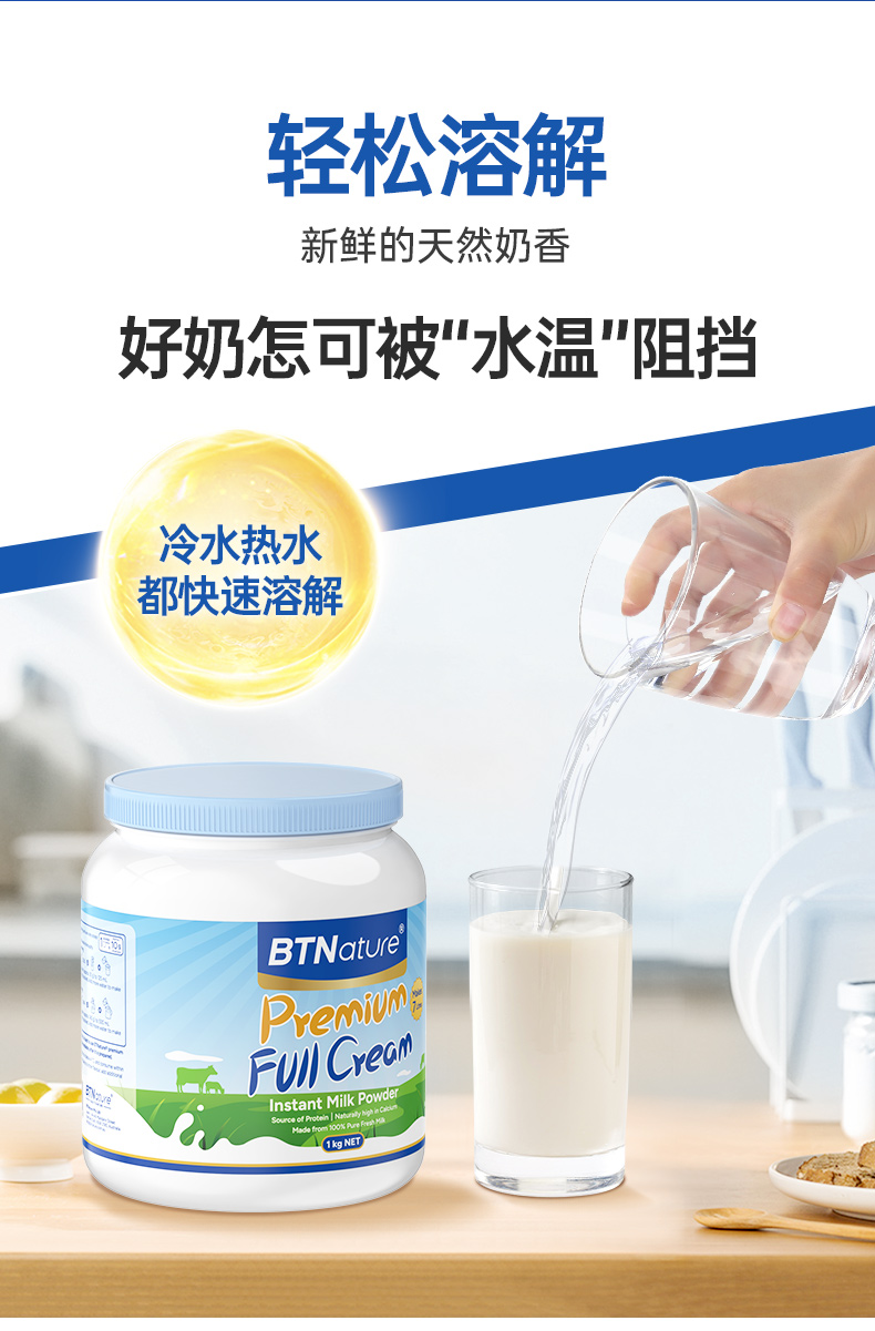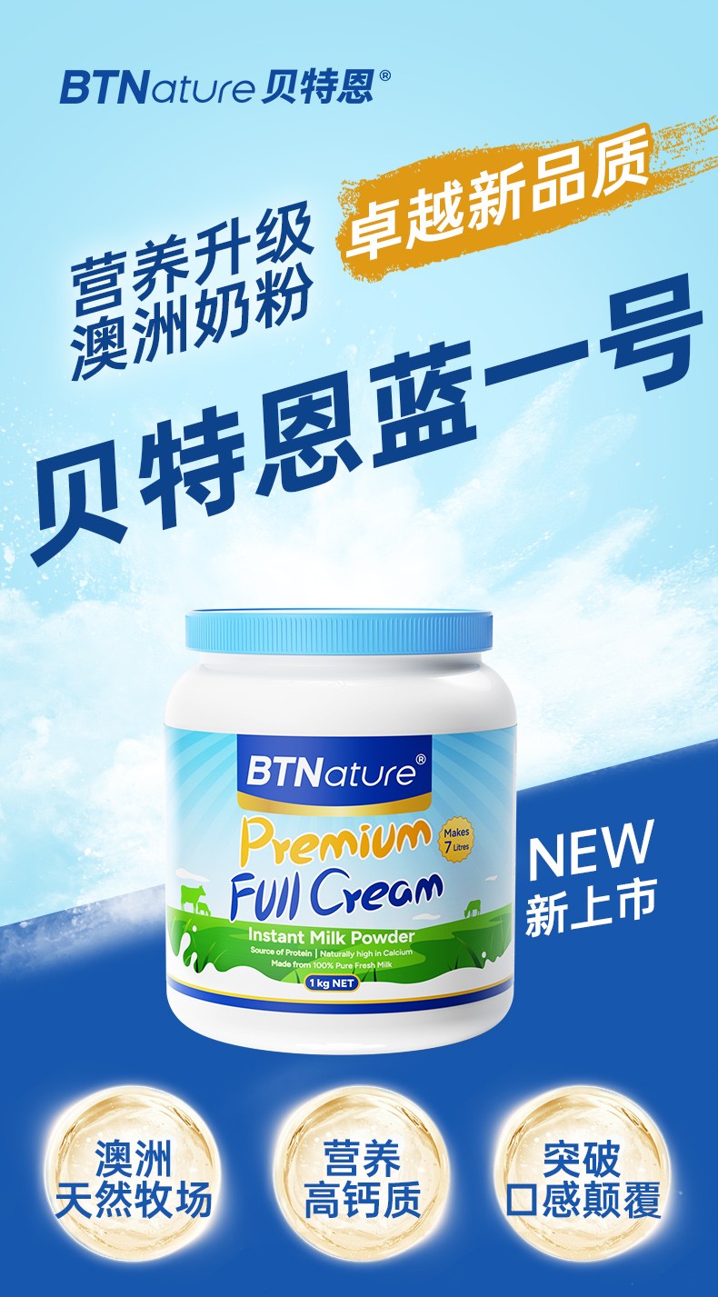 澳洲BTNature贝特恩蓝一号成人全脂高钙牛奶粉 1kg/罐